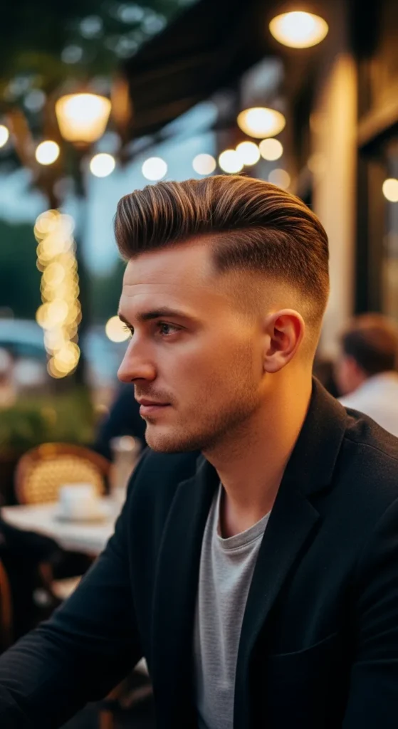 A smaller, tighter pompadour paired with a skin fade delivers volume without the weight. It’s perfect for summer when you want height but still need a breathable, controlled look.