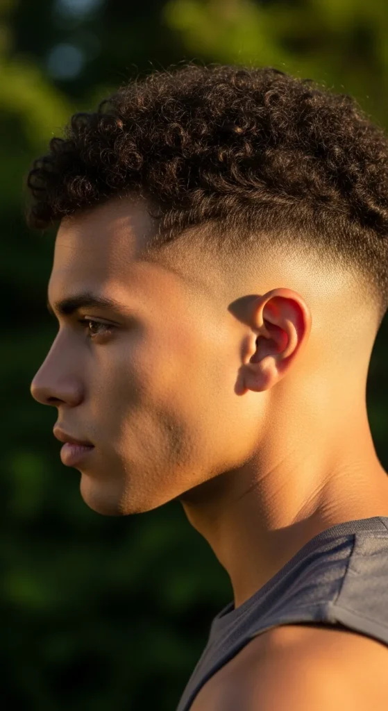 For naturally curly hair, a tight skin fade with defined curls on top creates a clean yet textured finish that feels fresh and breathable.