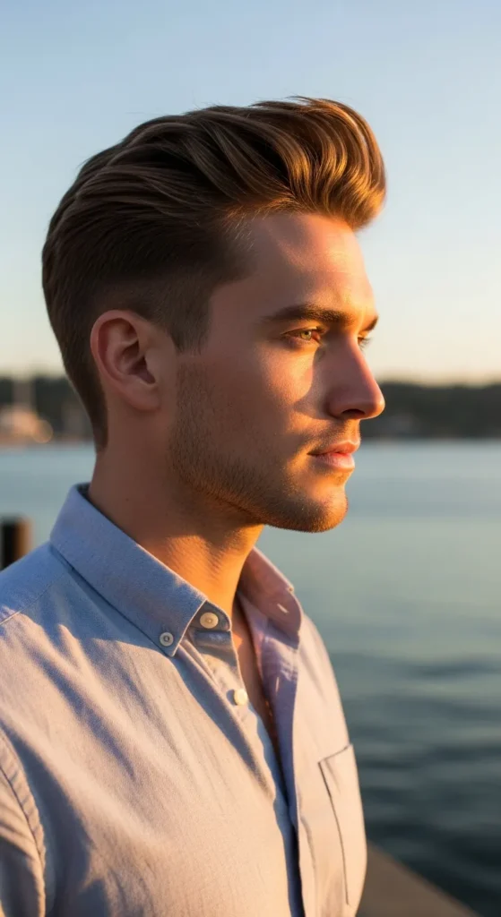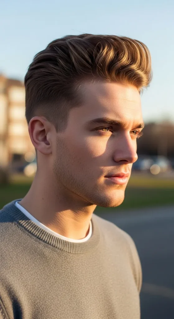 Hair flows slightly backward with strong lifted roots, creating a smooth wind-swept effect. The clean taper fade balances the dramatic volume on top, making this style feel sharp, confident, and built for guys who want movement without chaos.