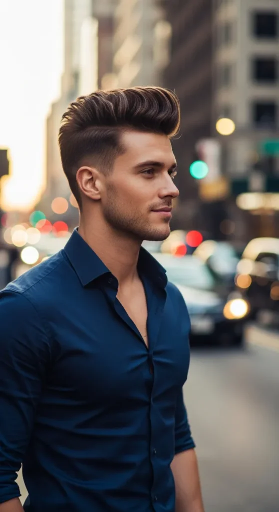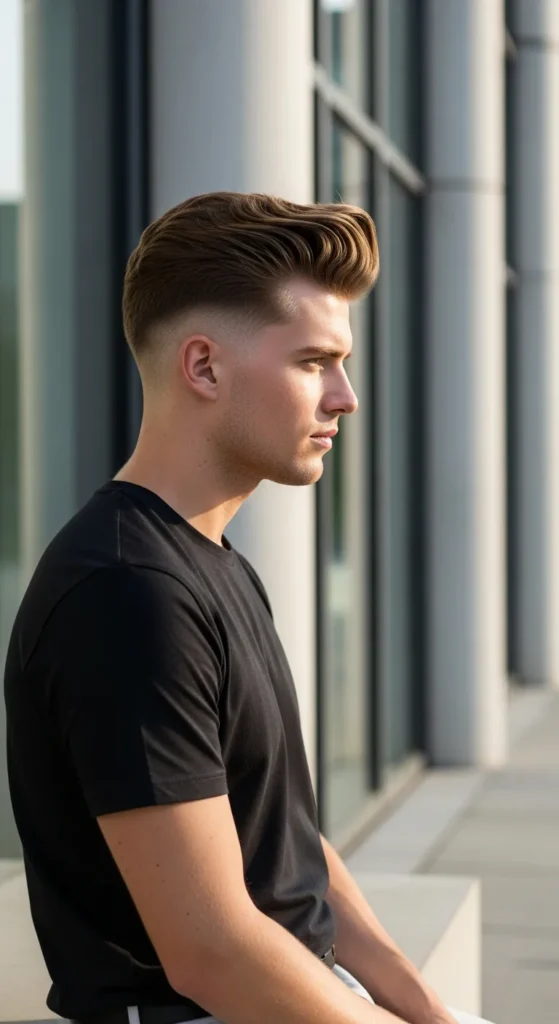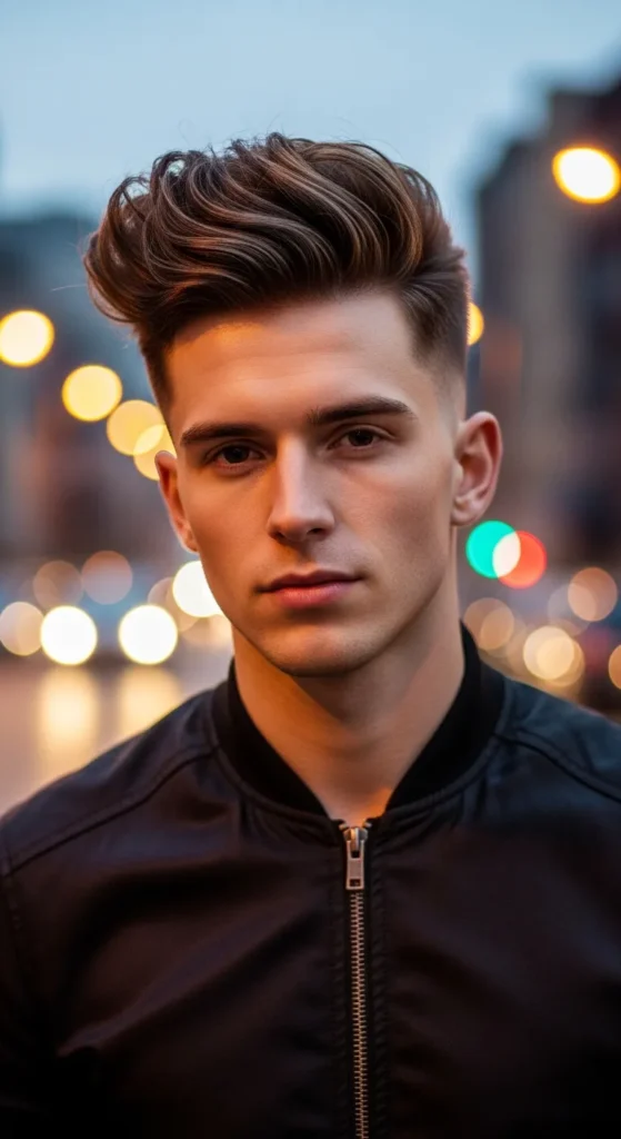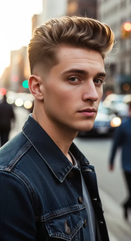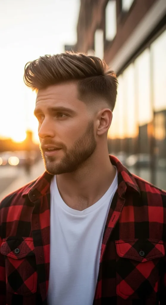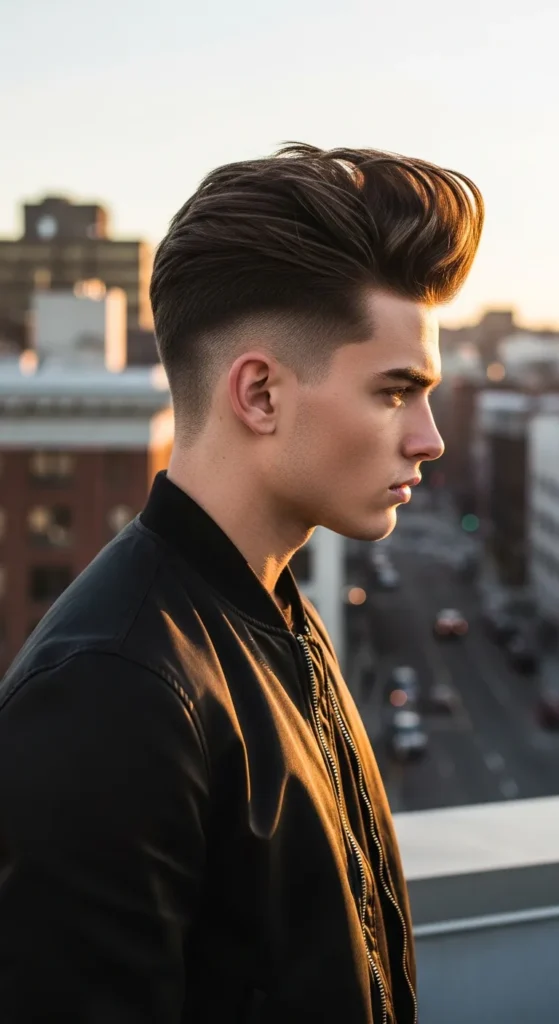 The top is styled upward with noticeable height, almost forming a skyline-like shape. Paired with a tight taper fade, it gives strong structure while still feeling relaxed and wearable for everyday style.