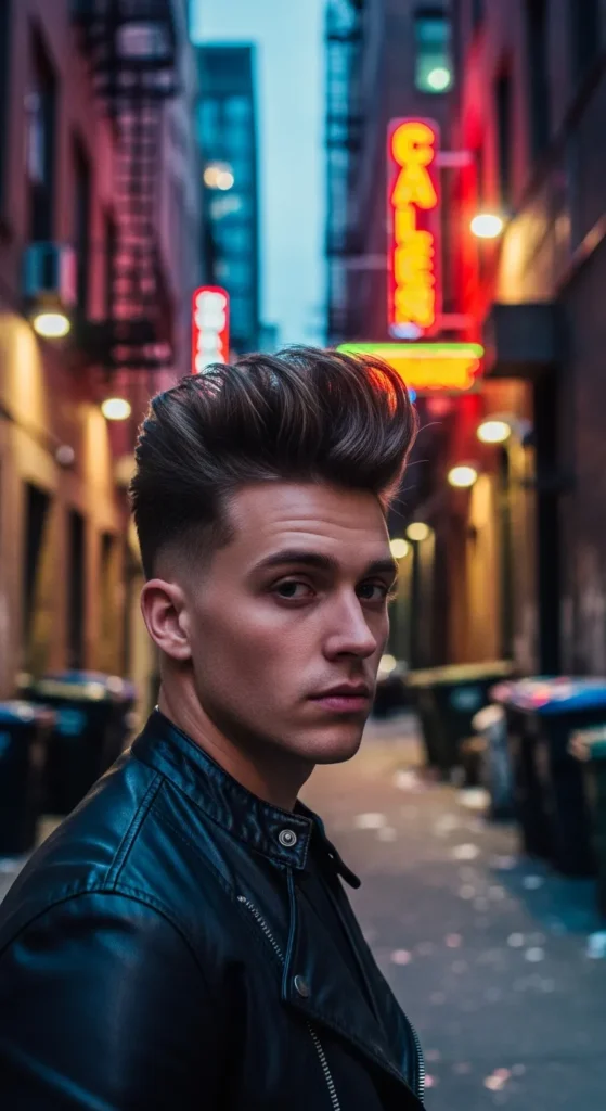 This bold variation pushes the hair upward and slightly forward, almost defying gravity. The clean taper fade grounds the style so the height feels intentional rather than messy.