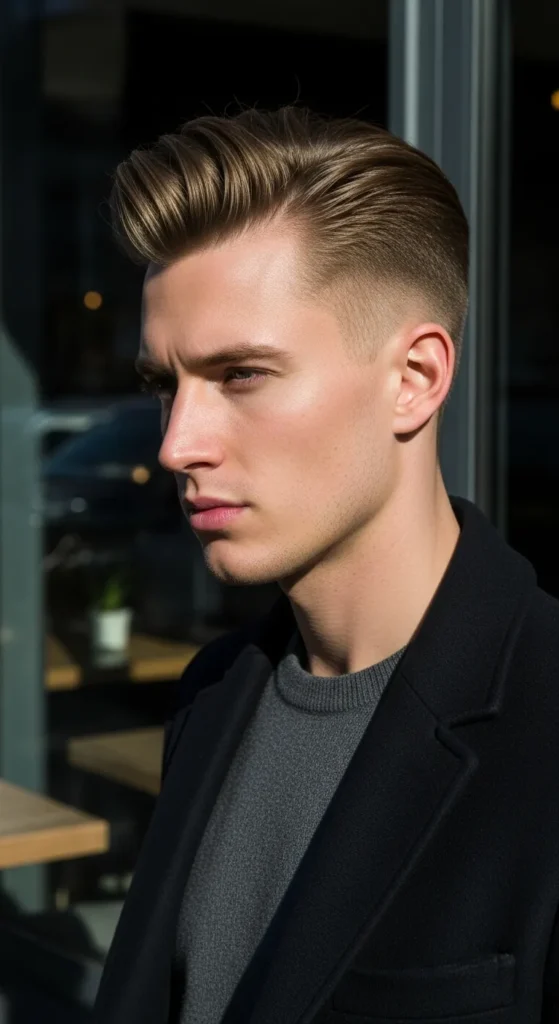Volume builds from the front and sweeps strongly toward one side. The taper fade keeps everything balanced, making the style bold but still clean and structured.
