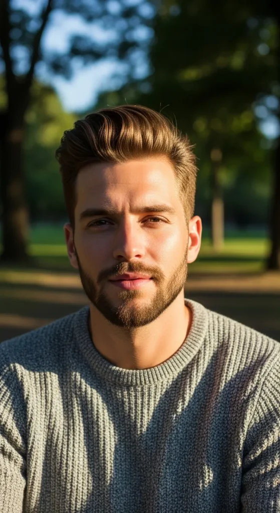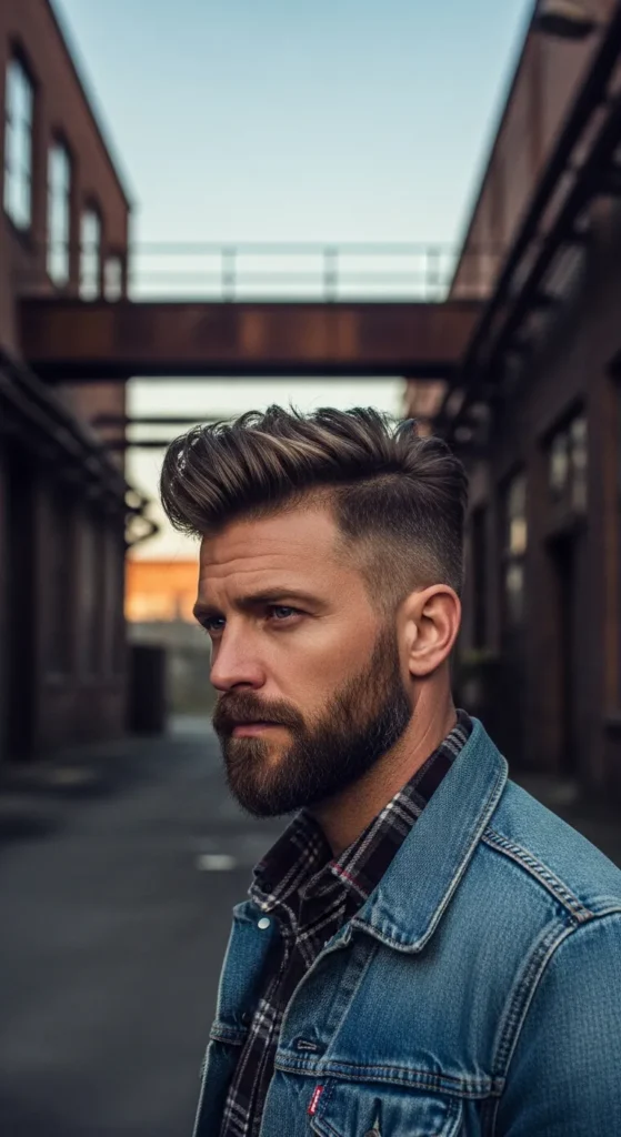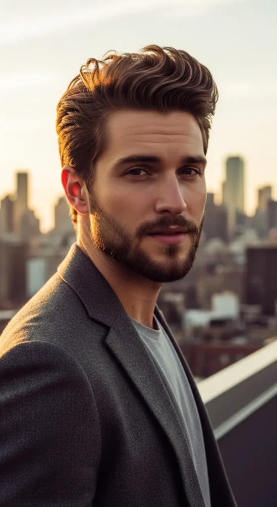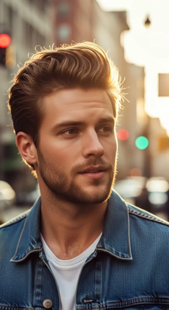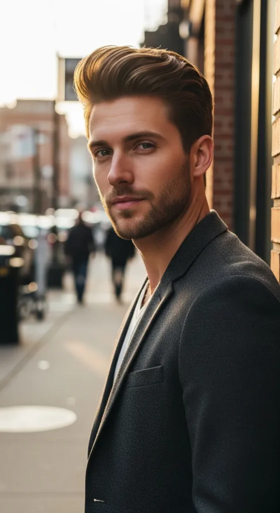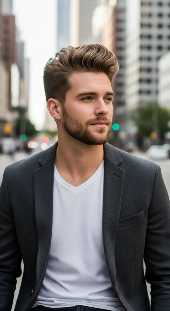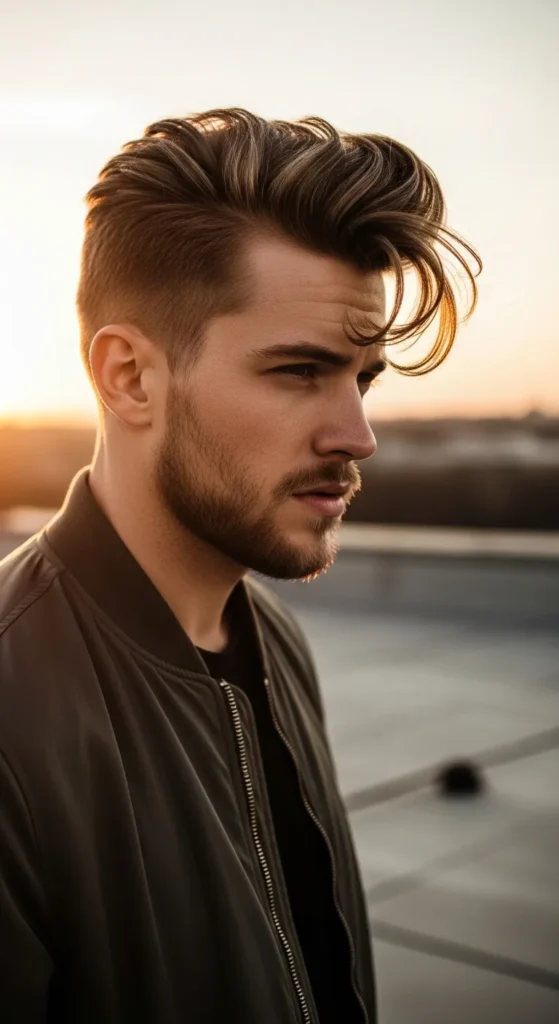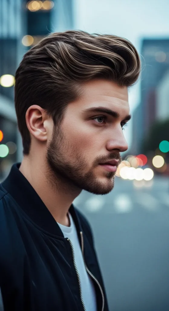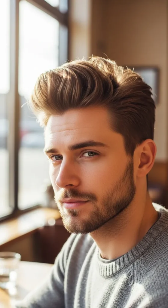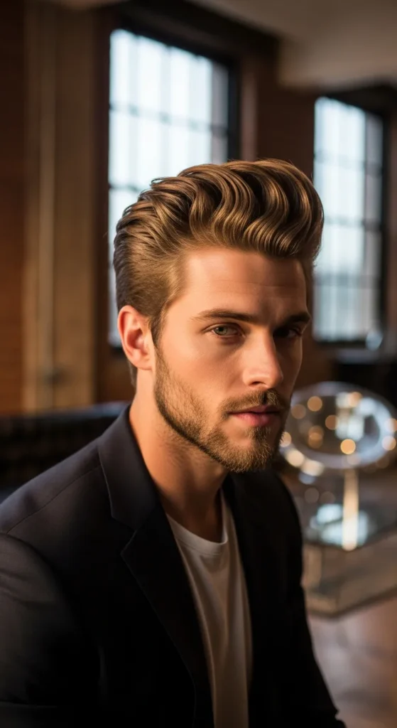 Inspired by beachy texture, this pompadour looks airy and slightly windswept. The sides stay clean while the top flows back loosely, giving it a carefree vibe that looks natural rather than styled.