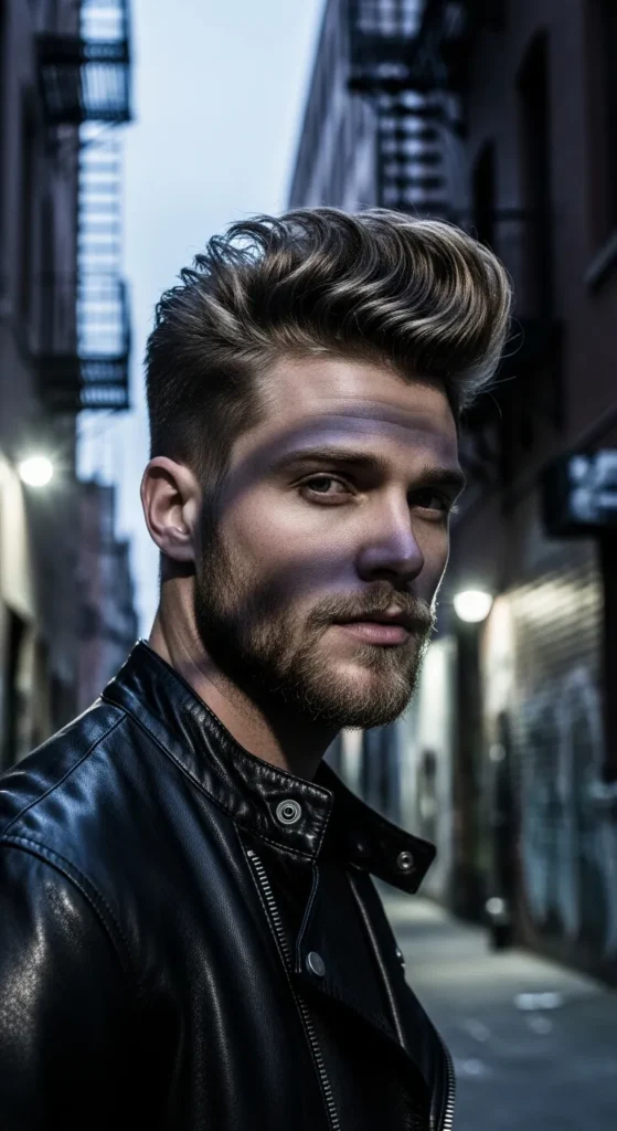 This pompadour leans into a slightly rough texture. The top has strong separation, giving it a masculine and rugged feel while still keeping the signature pompadour lift.