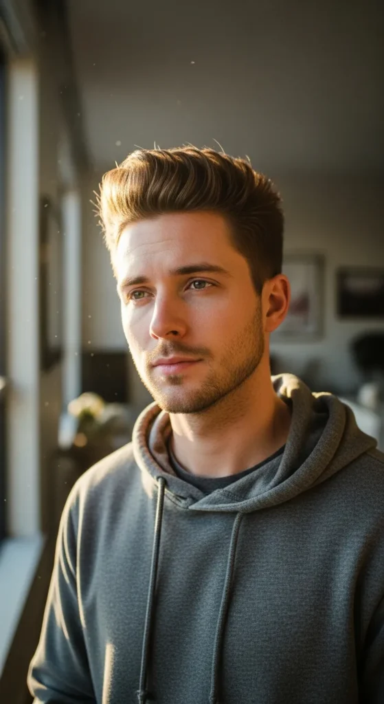 Instead of forced volume, this style relies on the hair’s natural direction. The front pushes up softly and blends into a relaxed textured top.