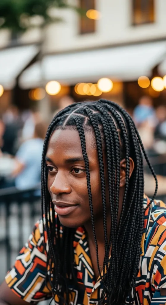 Medium-length box braids styled flowing backward create movement and attitude. It’s bold but practical, perfect for switching between relaxed and styled moments.