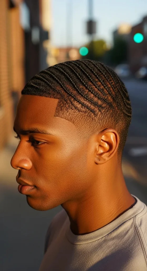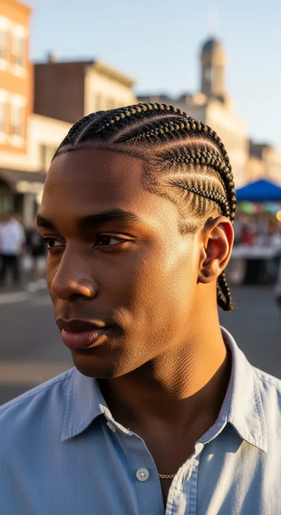 Creative cornrow patterns with curves or geometric parts bring a bold artistic statement. This style instantly stands out in photos and real life.