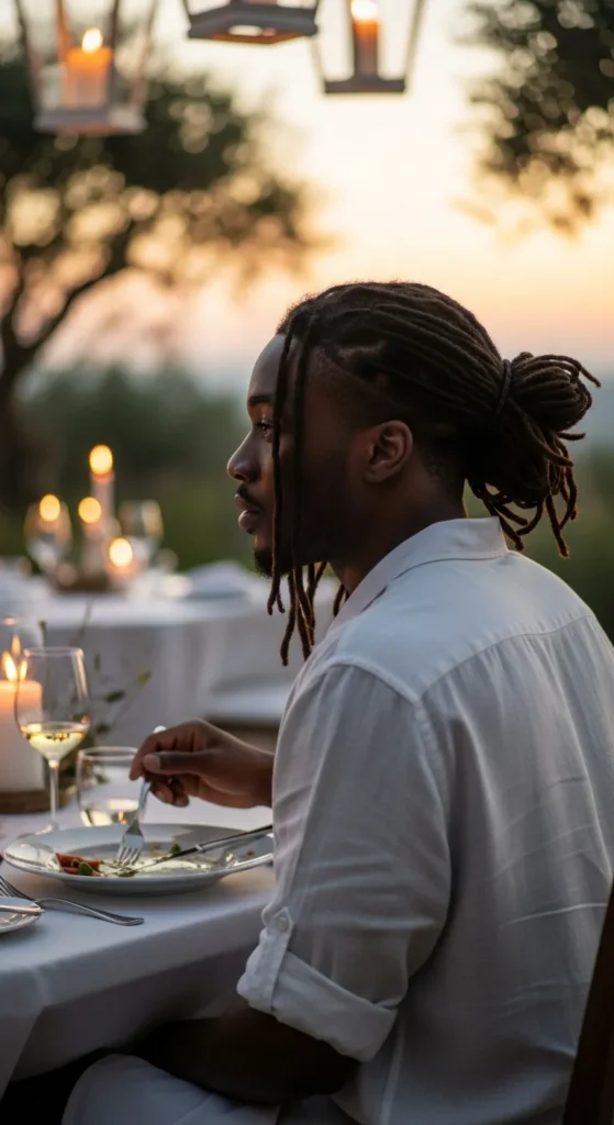 Locs tied into a low bun create a calm, composed look that still carries a strong personality. Perfect for switching between relaxed and upscale moments.