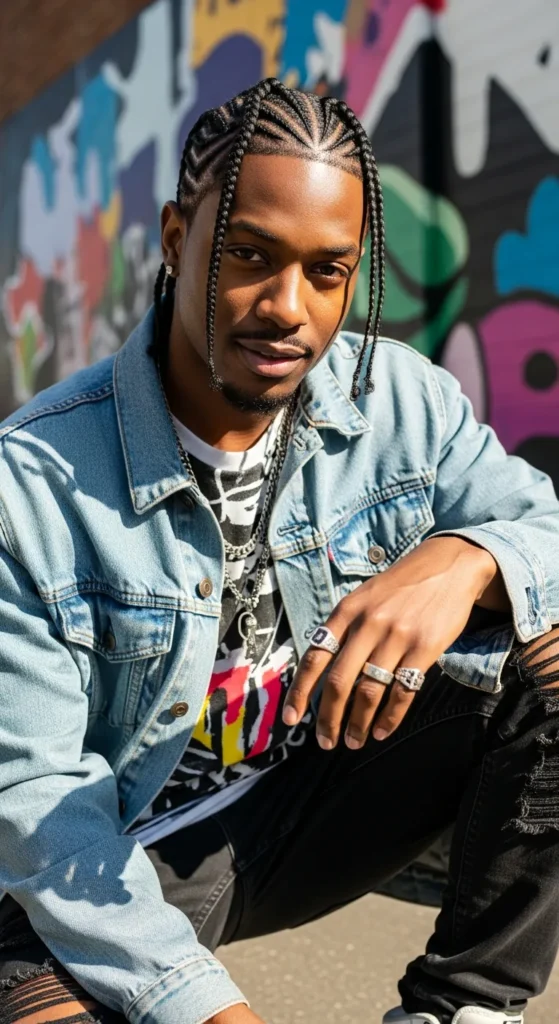 Tight cornrows leading into loose braids at the back create a crown-like effect that feels bold yet controlled. This style balances structure with movement, making it perfect for travel days and nights out.