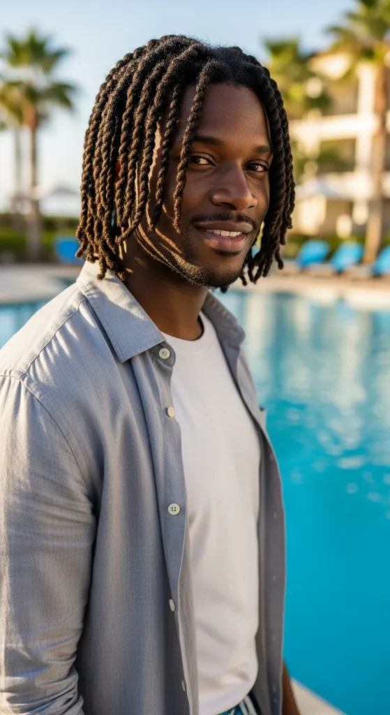 Barber Suggestion: Keep your scalp hydrated with a lightweight oil spray. Twists exposed to sun and salt can dry out fast, and hydrated roots keep the style fresh longer without frizz.