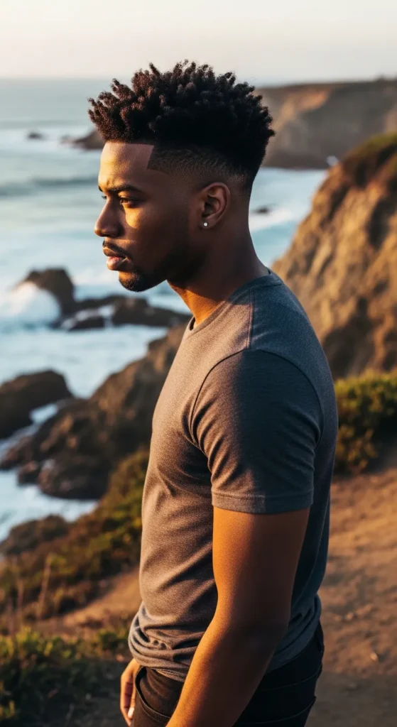 A clean tapered cut with a compact afro top gives balance between bold texture and neat edges. It’s low-maintenance but still visually strong.