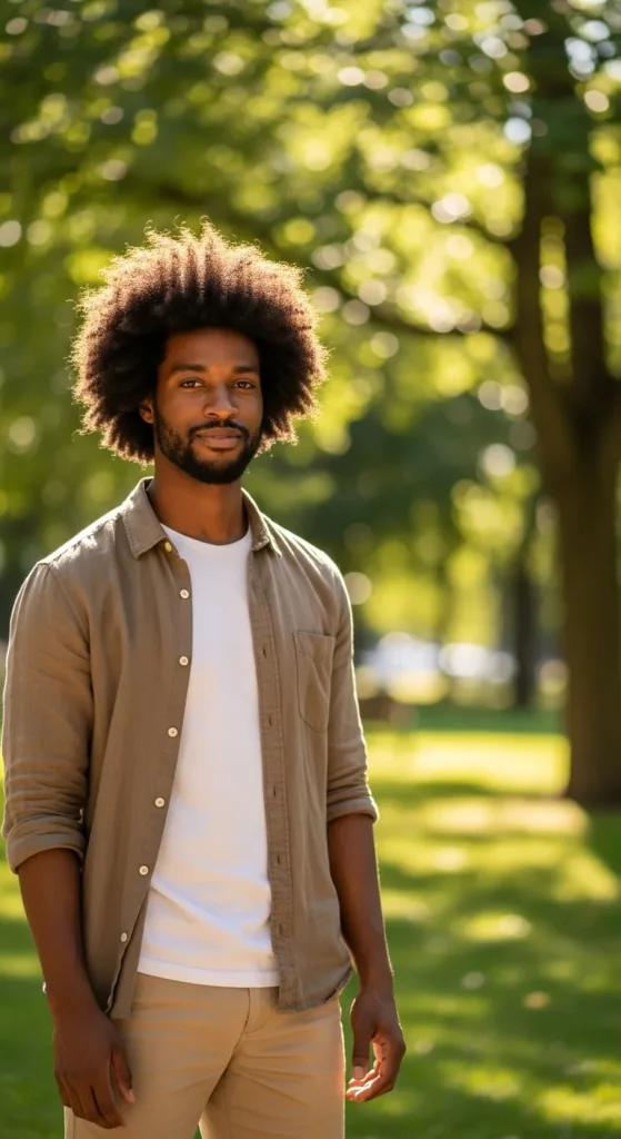 A full, rounded afro with enhanced curl definition gives volume and presence without trying too hard. It’s bold, timeless, and thrives in warm, open environments.